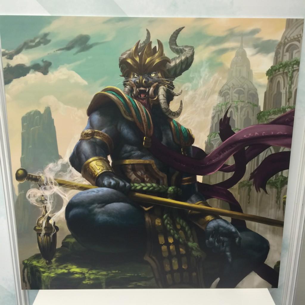 Um Rakshasa, no qual podemos perceber os chifres e um ambiente de um grande templo. Uma bela dica de como será a aparência geral dos Rakshasa. O problema é que não consigo identifica-lo com um dos clãs. Meu medo é que eles não sejam decks dos clãs (NO!), mas esse medo acaba quando lembro que são parte das promocionais. Provavelmente Sultai ou Abzan, sendo o primeiro preferível pelos templos ao redor.